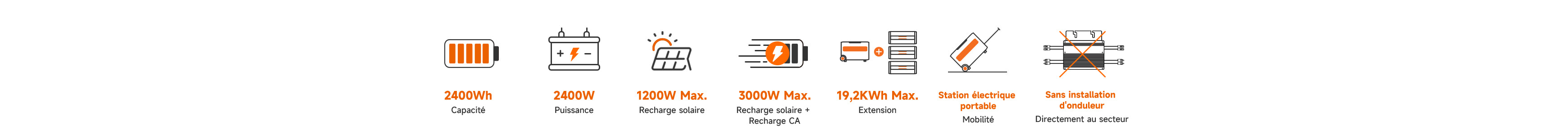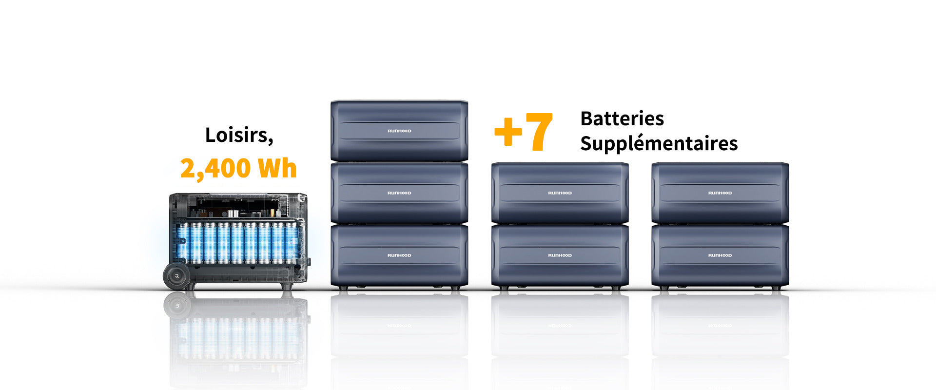 Le F2400 et chaque batterie d’extension B2400 offrent une capacité de 2,4 kWh. Ensemble, le F2400 et le B2400 combinent une grande capacité énergétique sous un format compact. La capacité peut être étendue jusqu’à 19,2 kWh en ajoutant jusqu’à sept batteries B2400 supplémentaires .